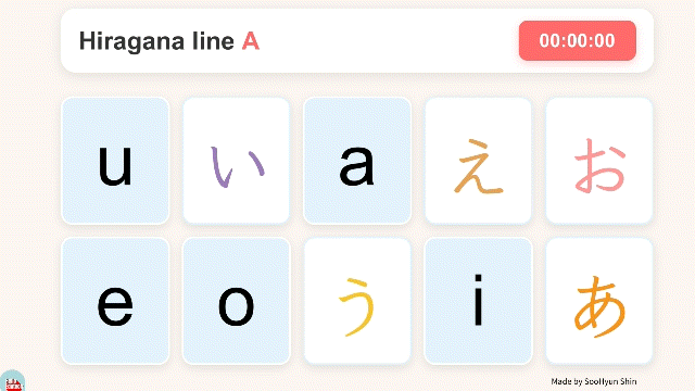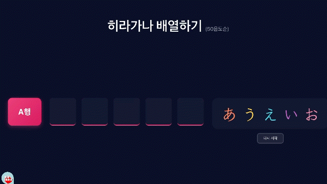 ① 히라가나 배열하기: 정답 시 체크 표시와 함께 행 전체의 색상이 변화하여 성취감을 시각화했습니다.