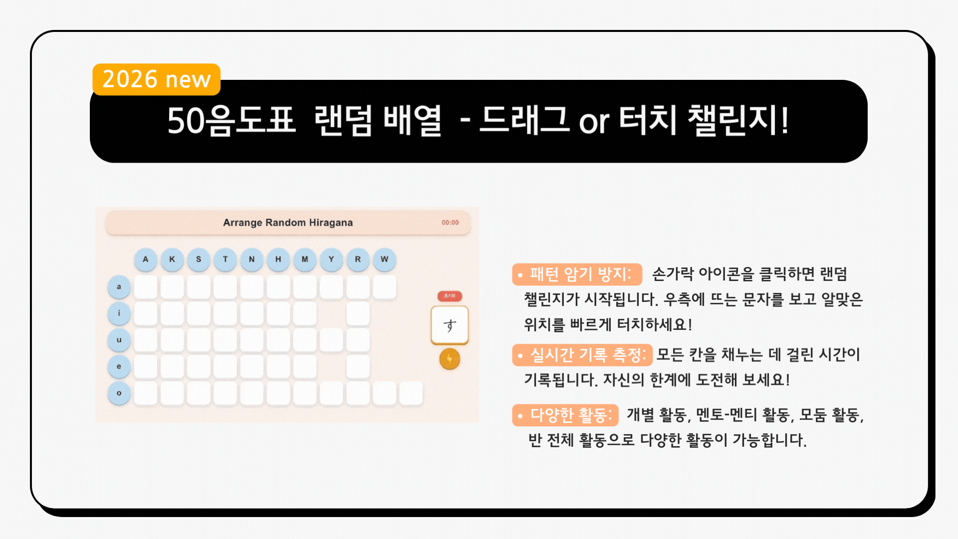 | [2026 New] 일본어 수업 준비 '0분'! 핸즈온 올인원 히라가나 E-워크북 업데이트 (A행, Ka행 콘텐츠 무료 체험+댓글 이벤트) (13) | 2026.01.27 |