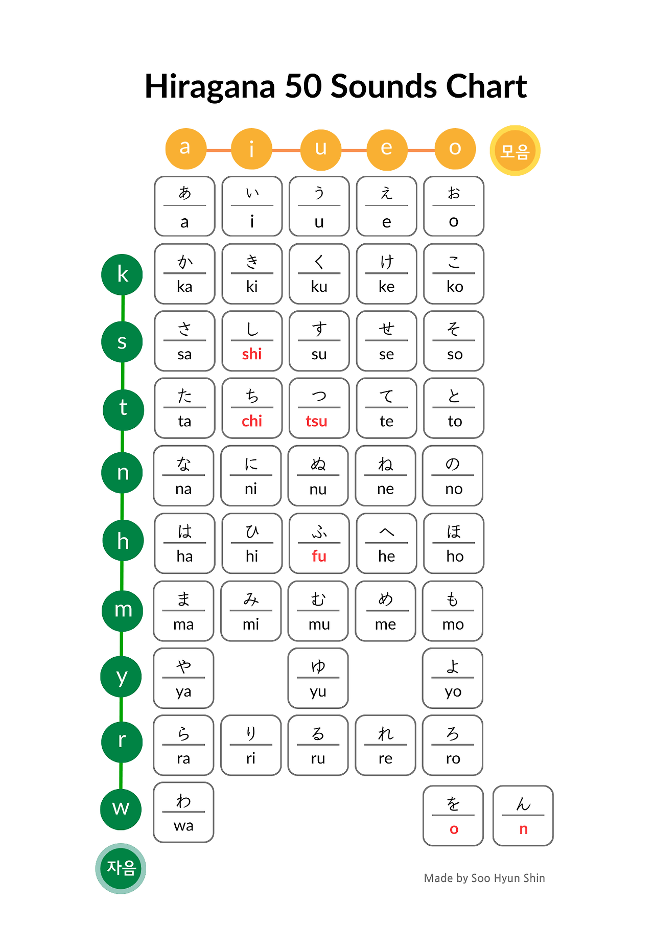 수업용 워크시트(오십음도표와 워크북 단어 정리표, 노래 가사 포함)와 히라가나 & 가타카나 기초 어휘 테마별 정리표 PDF 파일(30p) 제공합니다.