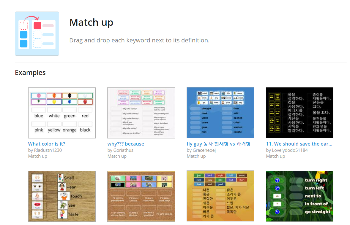 WordWall은 다양한 템블릿의 샘플을 제공해 주고 있는데, 샘플 템블릿의 콘텐츠를 편집해서 쓸 수도 있도, 처음부터 템플릿을 선택하고 자기의 수업맞춤 콘텐츠를 만들수도 있다.