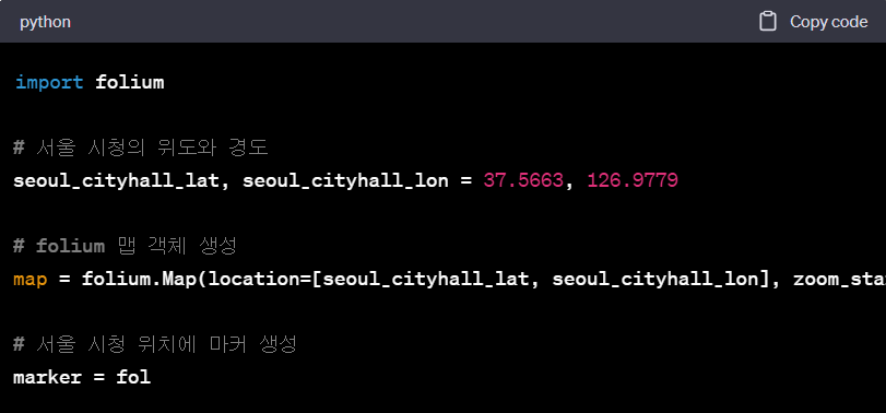 먼저 파이썬 folium 라이브러리를 설치 후 코드를 입력하면 된다.