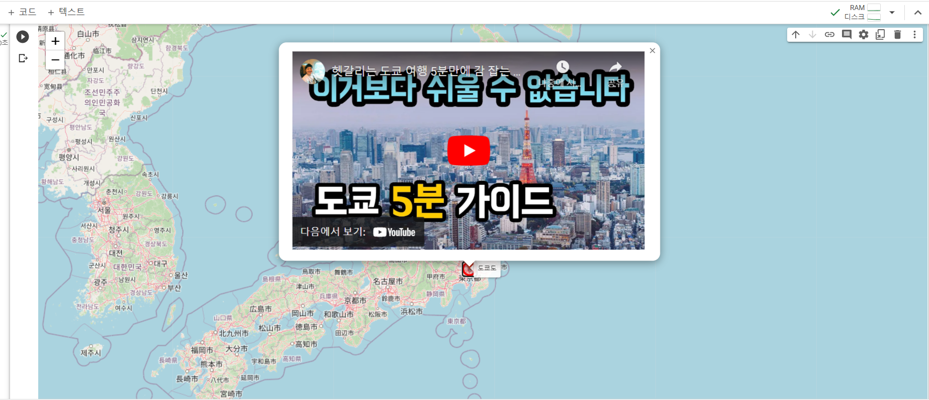 일본의 수도 도쿄를 빨간 별모양의 위치 표시로 출력 코드를 입력해 보자.