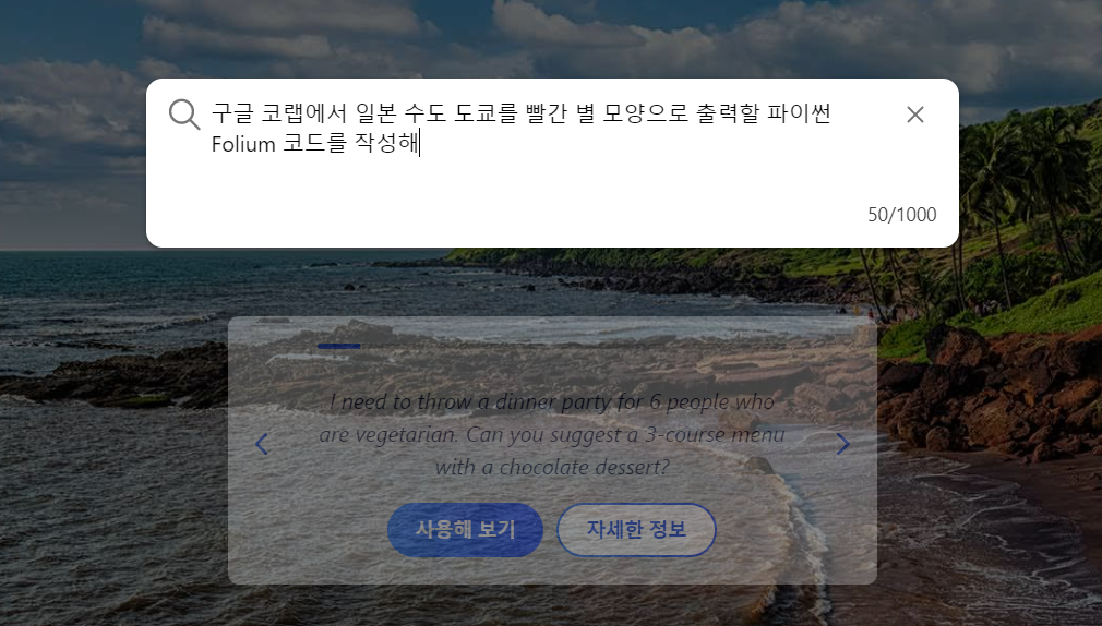 Google Bard에게 ChatGPT에게 했던 동일한 질문(=프롬프트)을 번역기로 돌려 질문하였더니 Python Folium코드를 위도와 경도까지 넣어서 잘 작성해 주었다. 하지만 Folium 라이브러리를 설치할 코드(pip install Foluim) 없이 Python Folium 코드만 작성해 주어 조금 아쉬운 면이 있었다.