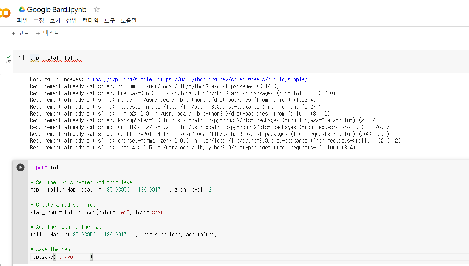 ② ChatGPT의 파이썬 folium 코드를 복사하여 붙여넣기 및 실행