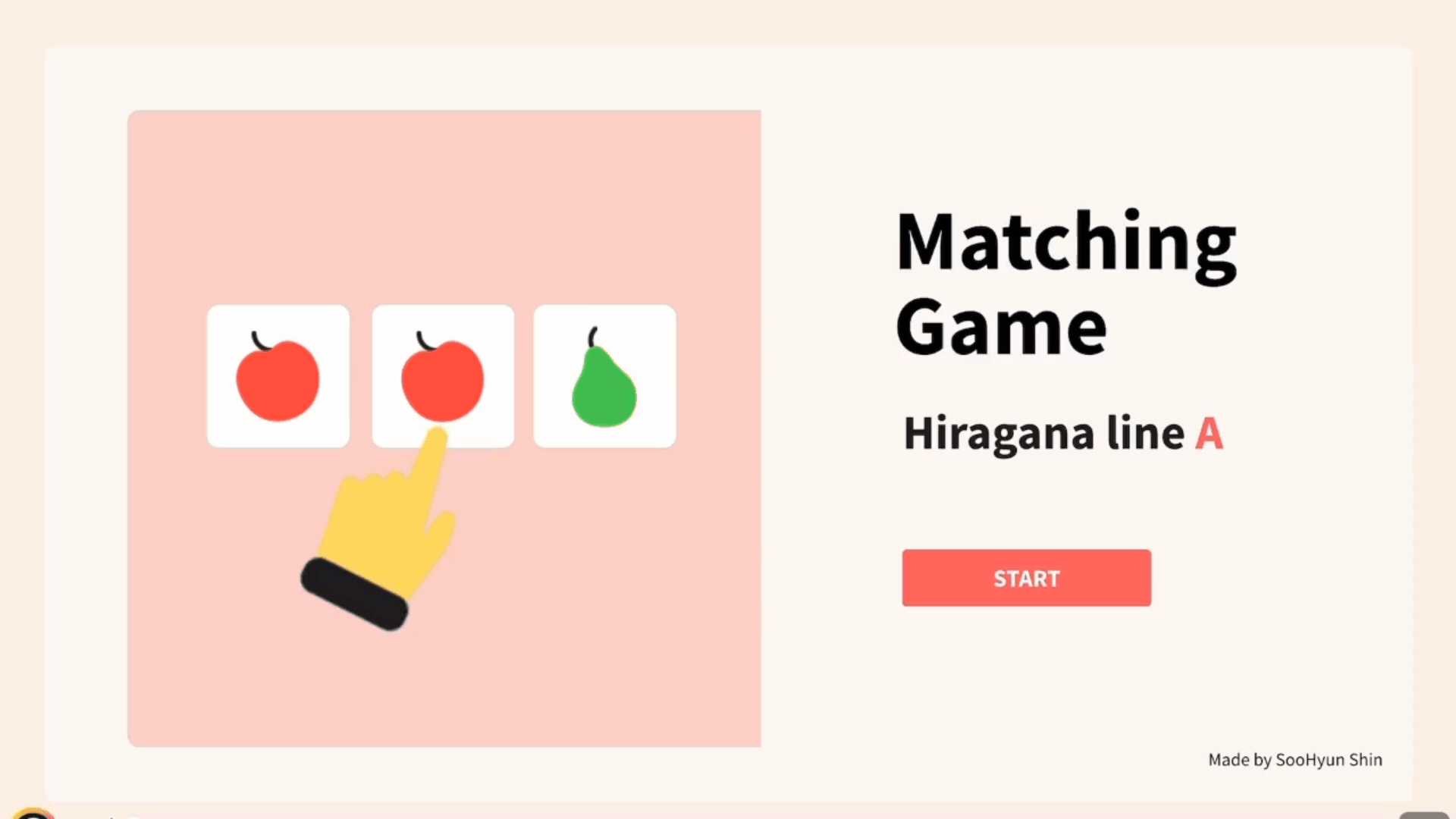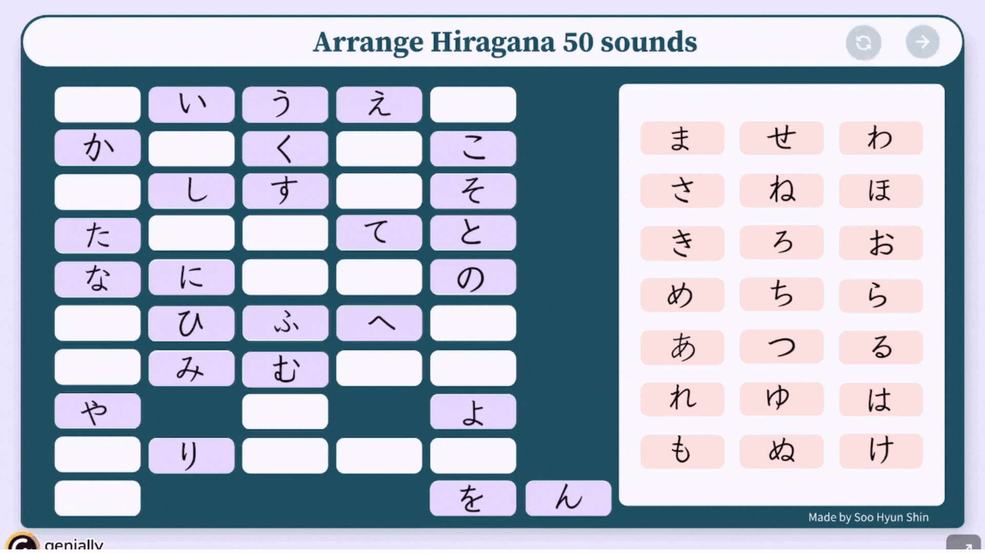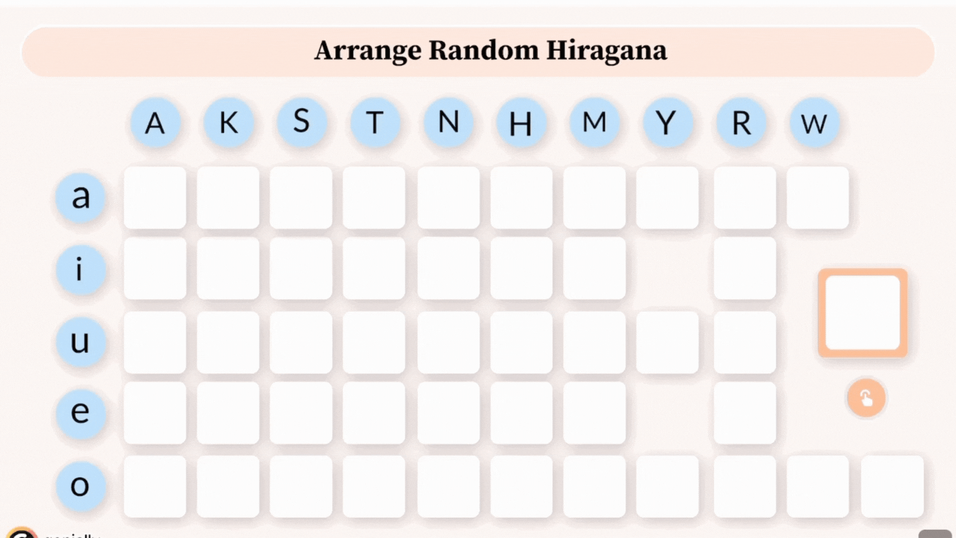 랜덤으로 하나씩 나오는 히라가나 문자를 히라가나 50음도표에 올바르게 배열하는 연습을 통해 학습자는 자신의 지식을 효과적으로 테스트하고 히라가나 문자의 학습 효과를 강화시킬 수 있다.