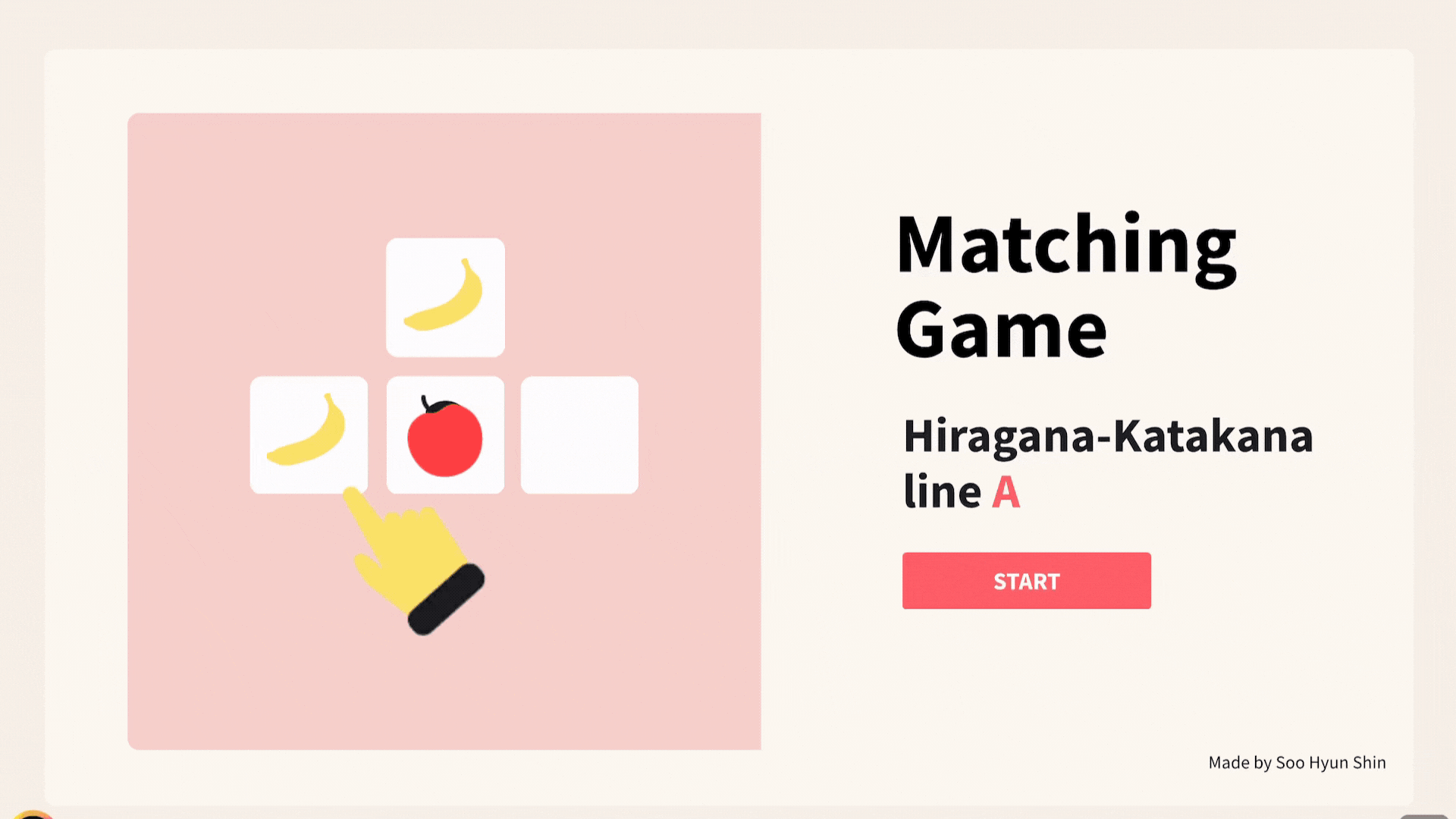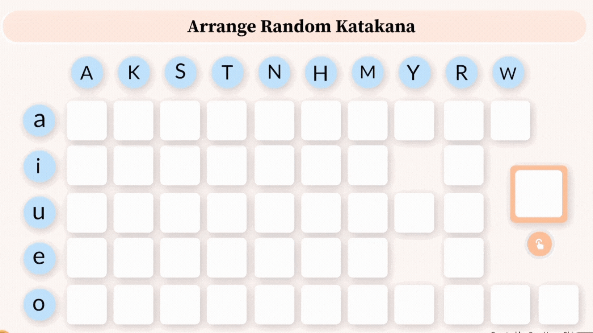 랜덤으로 하나씩 나오는 히라가나 문자를 히라가나 50음도표에 올바르게 배열하는 연습을 통해 학습자는 자신의 지식을 효과적으로 테스트하고 히라가나 문자의 학습 효과를 강화시킬 수 있다.