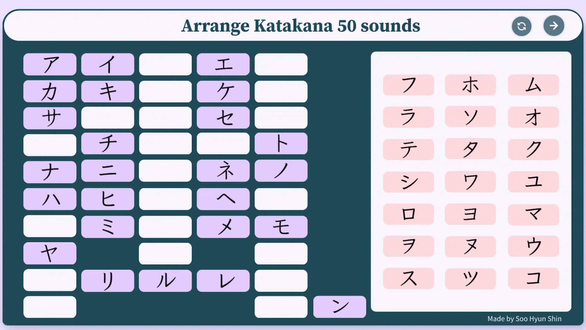 배열이 맞았을 때 자동으로 체크 표시되는 대화형 게임을 통해 혼자서도 히라가나 10개의 행 배열하기를 반복적으로 연습하며 가타카나 50음도 순서를 익힐 수 있다.